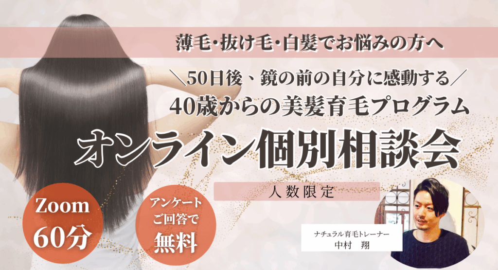 | ナチュラル育毛 個別相談(オンライン) | 5,000円(税別) | 現状ヒアリング+あなた専用プラン提案/キャンペーンで無料の場合あり |